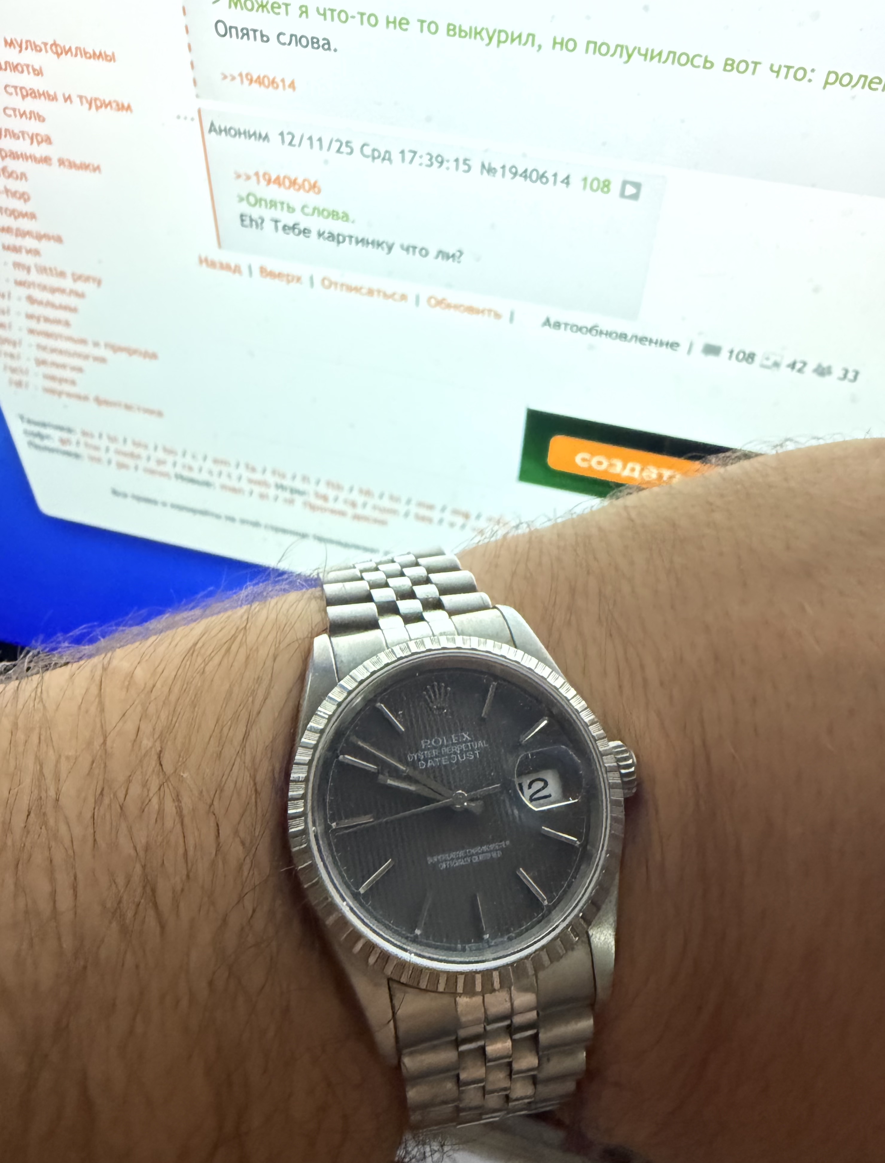 >>1940604 > Может я что-то не то выкурил, но получилось вот что: ролекс мне никогда не нравился, а тут глаз зацепился за datejust 16220 с серым tapestry dial, 95го года. Опять слова.