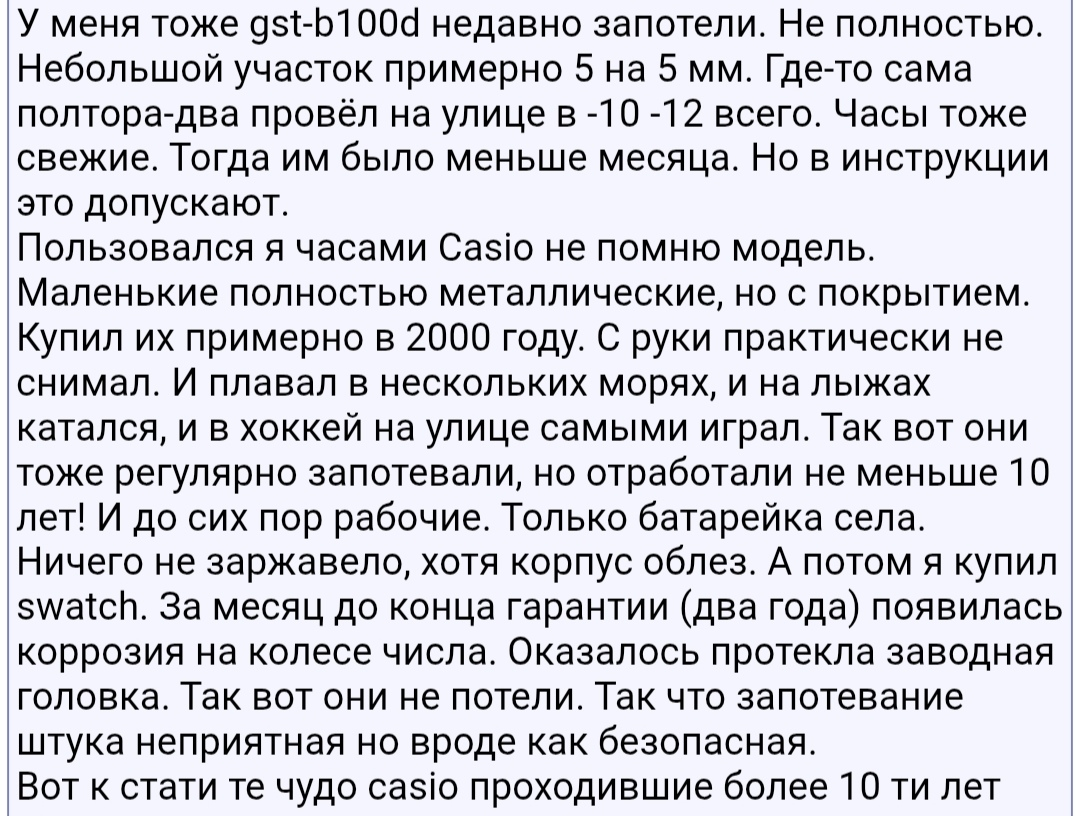 >>1947798 Идиотизм. Слышал про такую вещь, как относительная влажность воздуха? Так вот ты от нее никуда не денешься при сборке. Как раз она является признаком герметичности часов. Полагаю, что шоки потеют чаще других часов по причине того, что у большинства пластиковый корпус, который менее теплопроводен, нежели металл.