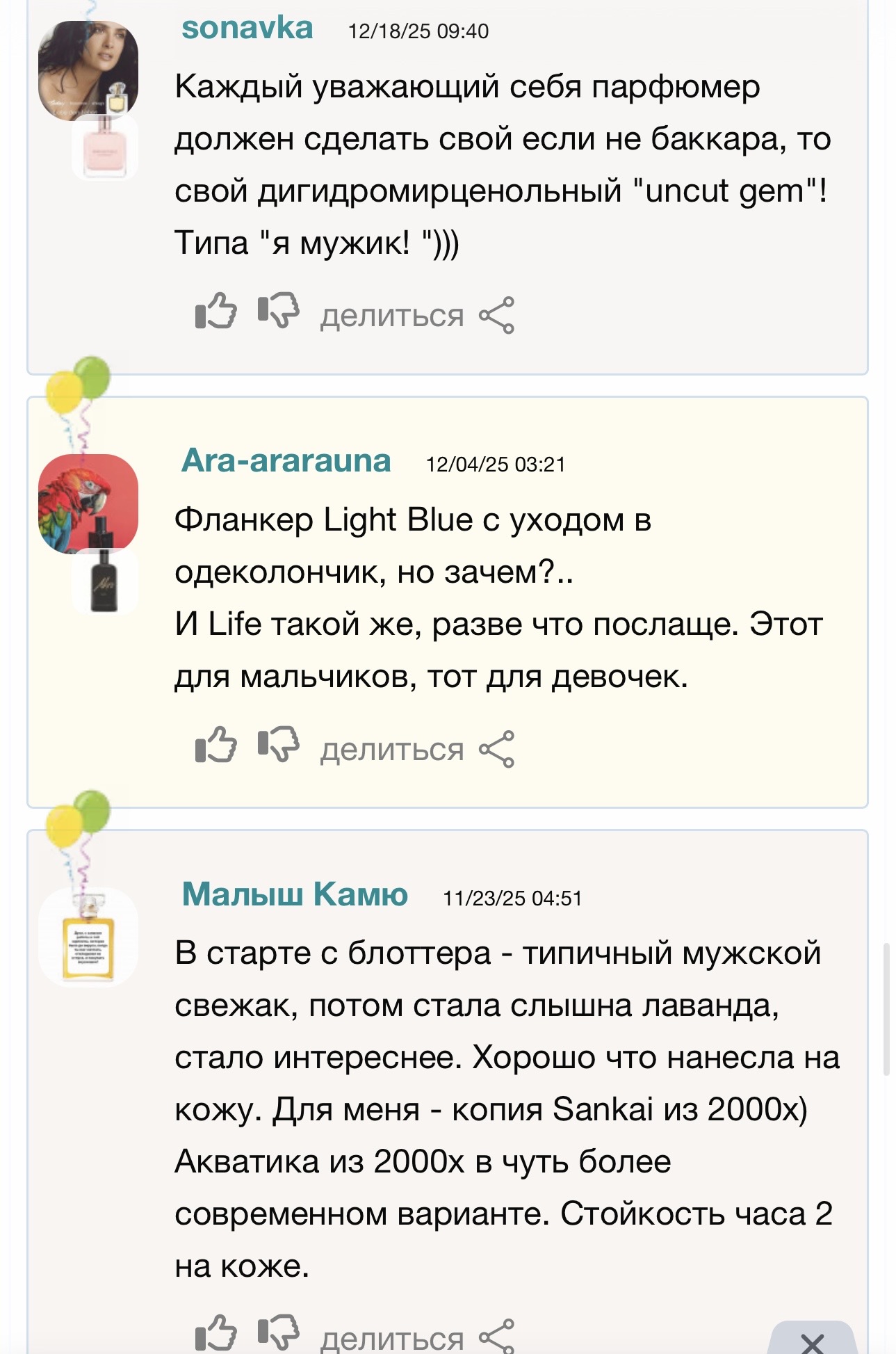 Подскажите свежачок люксовый не дорогой до 10к. Пока кандидаты: 1. Jimmy Choo man aqua - соблазнился на то, что его подписал Раскине, а я его уважаю за малевский The Moon. Хочу затестить 2. Балдессарини Амбре Фреш - забайтился на арбуз в верхних нотах. Помню, что тут были в треде парочка арбузных охотников. Может тестили? Сам нюхал в магазе, показалось, что ничего особенного, но я уже забыл чем он пахнет, а сейчас как раз ищу что то такое простое и обычное, свежее. 3. Коч мен блю - просто нечего сказать, попался под руку, был в предложке аллюрпарфюма как свежий. В магазах нет, есть отливант. 4. Азарро Хром аква. В свое время таскал оригинальный хром и довольно урчал. Потом прокачал рецепторы и стал ощущать его химзность (собственно, по этой причине не рассматриваю химозные свежаки нулевых типа версаче о фреша). Этот аромат делал горячо мною любимый Эро, поэтому обязательно хочу его затестить, хотя на фраге почему то бомбят на него, мол каким то пластиком пахнет. 5. Montblanc Legend Blue - оттаскал сотку белого спирита в свое время. Получал комплименты и довольно урчал, подумываю повторить, но конкретно сейчас ищу что то более свежее. Вот новиночка + тут еще и Зидан (!!!) выбран лицом аромата. Я не футбольное быдло, но финал ЧМ 2008 навсегда в сердечке даже у меня. 6. Карл Лагерфельд блю джинс - по нотам вроде как вообще прямое попадание в яблочко - акватика, имбирь, мох, комменты про "пену для бритья", ну прям то что нужно. Смущает что это очень слабый бренд как сам по себе, кроме буа ветивера я ничего от них хорошего не видел.