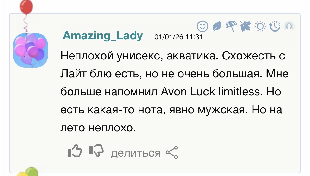 >>1954198 Относил флакон 001, на весну возьму ещё флакон. Простой приятный аромат на каждый день осень/весна, никого вокруг не задушит, окружающим нравится.