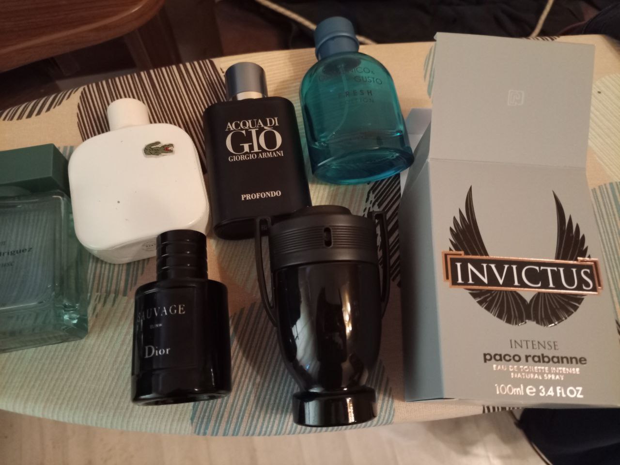 Лакост в офис/ после душа АДГ в зал / на весну ДГ на лето в жару Нарциссо чисто в магаз сбегать Инвиктус на осень/зиму Саваж эликсир для важных встреч/собеседований