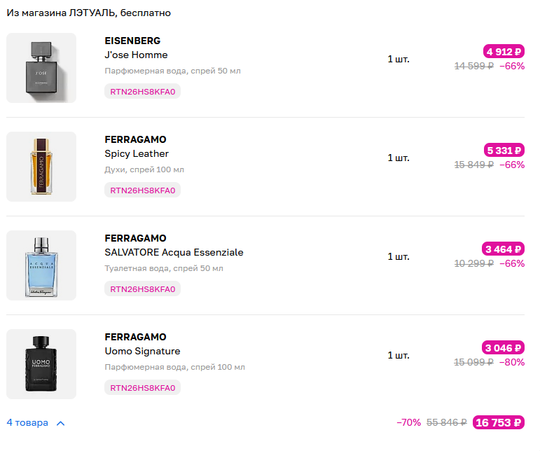 >>1959669 Кстати, о Летуале с их 50К праздничных баллов, заметил, чем больше в одной корзине покупаешь, тем больше проходят скидки (ну до исчерпания баллов, естественно). Ну и что думаете о феррагамо? Пойду сегодня тестить, за такую цену не очень жалко будет, если середняки.