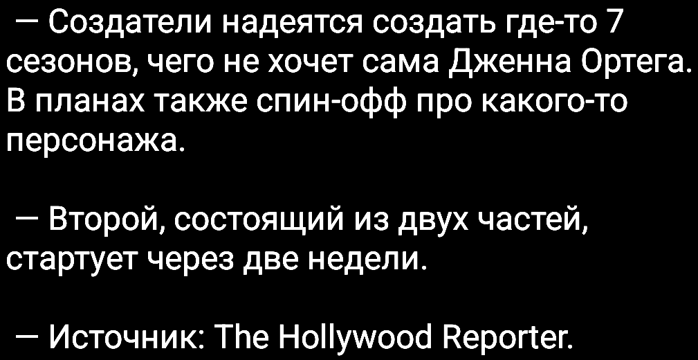 Новости и слухи инфа с кп (комсомольской правды): Съемки третьего сезона назначены на ноябрь 2025 года. Место съемок не изменилось — Ирландия. 1-2: 7 сезонов это конечно ахуеть, перебор. Сезонов 5 норм. Спин-офф будет ожидаемо про Гомеса. Еще мелькнул слух о том, что Дженна ведет переговоры о съемках в перезапуске "Капли" 1988года 3: не первый раз всплывает эта фотка, может намек на 6 часть пиратов? Хочется конечно чтобы наша королева снялась с королем голливуда пс. ах да, еще ей дадут какую-то большую роль в марвеле, но это опять же слух Слухи если что даже не ин100граммной ленты, а вкшной Кинопроекты по убыванию интереса к просмотру (имхо): 1. Уэнсдей 2. Бодрый хоррор 3. Пираты 4. Марвел