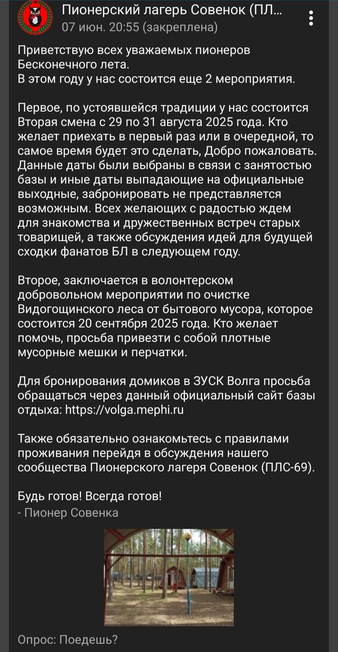 Анонимный источник, близкий к организаторам фиста, слил в сеть переписку, подтверждающую подготовку к Совёнок-Фесту 2026. Олды Легиона набегаторов уже заявили, что фестиваль превратится в "зону тотального троллинга". На скриншотах из переписки администрации лагеря видно, что даты 15–17 июля 2026 уже забронированы под "мероприятие для поклонников визуальных новелл". В документе упоминается "ежегодный формат", что подтверждает планы Маркова.