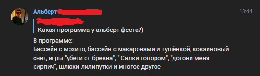 >>24910502 Это правда, но несколько наоборот. "Сюрприз от Альберта" в том, что это Альберт делает фест и нанял Маркова "шуршать по кустам" -- помогать с организацией. А также некоторых других оргов. Программа "Альберт-феста" (от самого автора): Бассейн с мохито, бассейн с макаронами и тушёнкой, кокаиновый снег, игры "убеги от бревна", " Салки топором", "догони меня кирпич", шлюхи-лилипутки и многое другое...