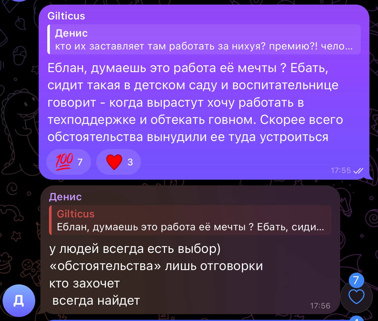 >>24922725 Тупая пизда (еще тупее Женечке, за что самой Женечке и нравится), начала выебываться в чатике провайдера, что ща пост в телегу напишет, на цельных триста тысяч! а после и вовсе на личности перешла