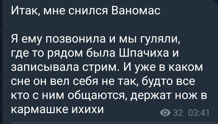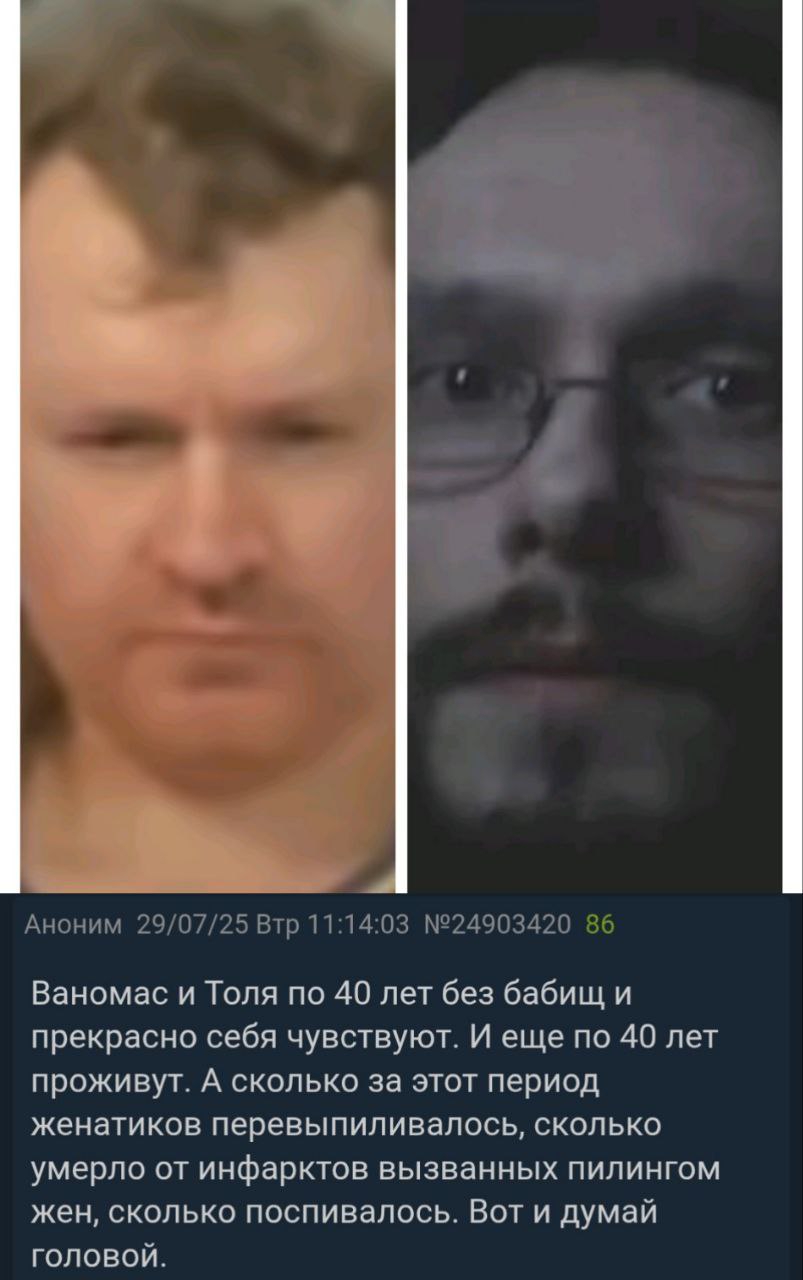 эт хуйня кста. ваномас уже полумёртвый и скуфанулся жестко. а он как раз симпил долго по шпачихе. он просто ультра-слабый, низкое, практически нулевое тесто(у него даже волосы на теле не растут) а тнус таких сразу подсознательно вычисляют и уничтожают. его даже на арене рандомные стримерки типа эльзы севенс попускали. у баб безотказно работающая прошивка уничтожать слабых самцов, чтобы передавались только лучшие гены. физически они убить не могут т.к. слабее потому доводят до суицида ментальной давкой, либо натравливают на них более сильных самцов. те олени которые будучи слабыми умудрились влезть в брак кончают так же, в петле или топятся в алкашке. толян таже история, отрицательно тесто и кандидат на уничтожение но он ни к 1 бабе не приближался за жизнь. потому и остался наивным шизо-дурачком и выглядит не так жестко постаревшим. а вот патлая бабка с арены чисто примат, потому и ваномаса попускал и жену выдерживает. но даже по нему видно как уходят силы. =нение=
