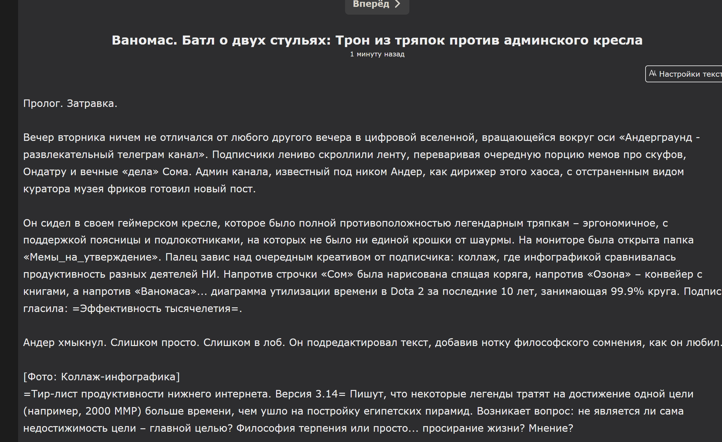 >>24927987 Хуйня В дипсике лучше. Там ии дошел до того что шпачиха после аборта принесла васятке своего заспиртованого зародыша в банке и васятка его поставил как артобъект.