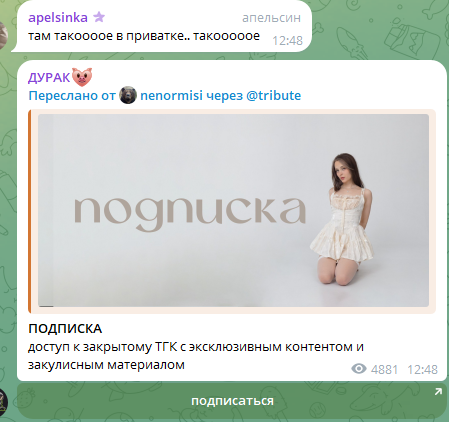 >>24927543 Кто не знает, раньге в тг был баг, что если вступить в приватку, и в чат, то с чата не кикает после окончания подписки, и с чата можно смотреть поста паблика. Это не баг по сути, а так работает тг, но года пол назад точно был баг что если состоять в чате и нажать на пост паблика то откроется обычный вид паблика и появится кнопка "Подписатся", как будто это обычный паблик, и можно быть подписаным на приватки бесплатно, по сути.