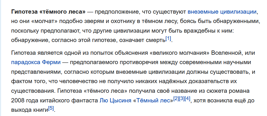 Гипотеза «тёмного леса» — предположение, что существуют внеземные цивилизации, но они «молчат» подобно зверям и охотнику в тёмном лесу, боясь быть обнаруженными, поскольку предполагают, что другие цивилизации могут быть враждебны к ним: обнаружение, согласно этой гипотезе, означает смерть
