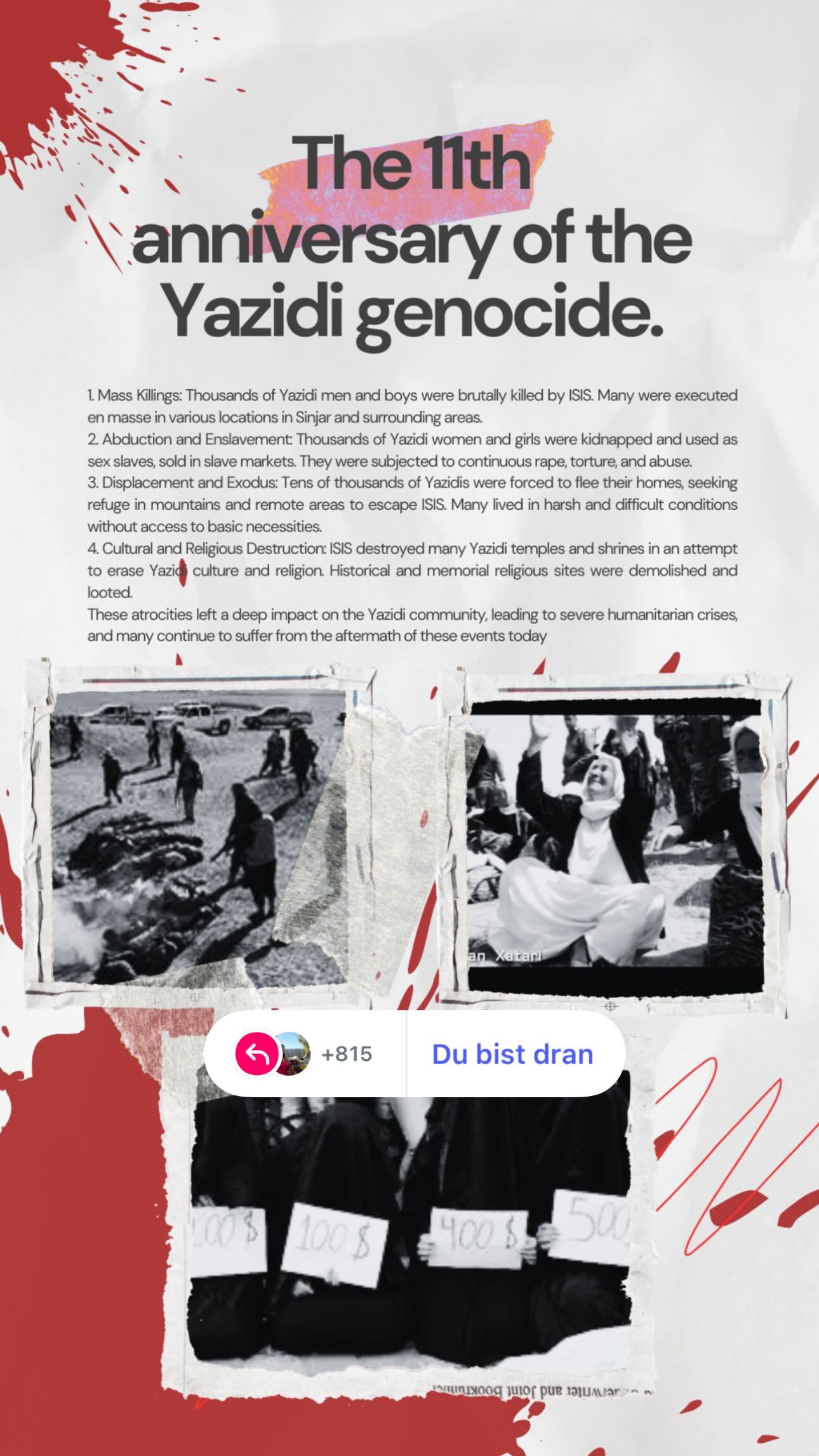 >>24934542 В смысле че за тряска? Тебе с английского перевести? 11-летие геноцида езидов ИГИЛом (запрещенная в РФ организация). Довольно нишевая вешь, просто так никто такое выкладывать не станет. 100% езид среди близкого круга.