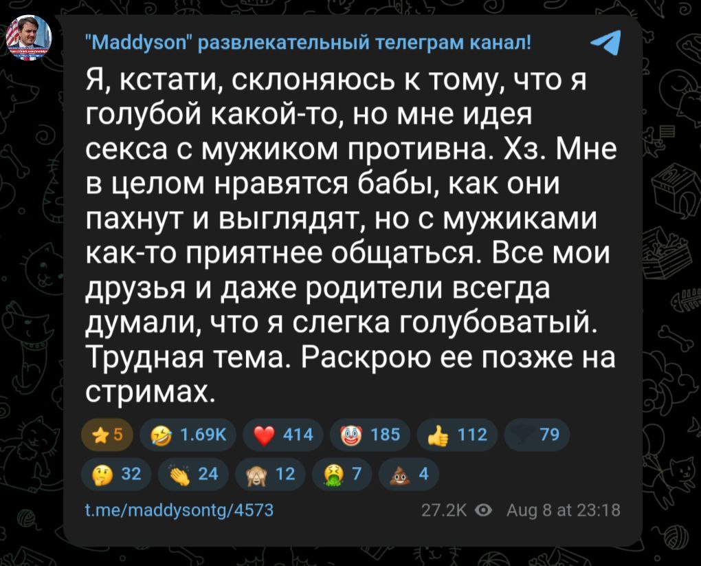 >>24971719 Кстати, апельсимп мало сидит на двачах, он больше в чате какает у Галины в тг, а вот какать сюда приходят исключительно отбитые люди с двача. Ну это так чисто вам на подумать.
