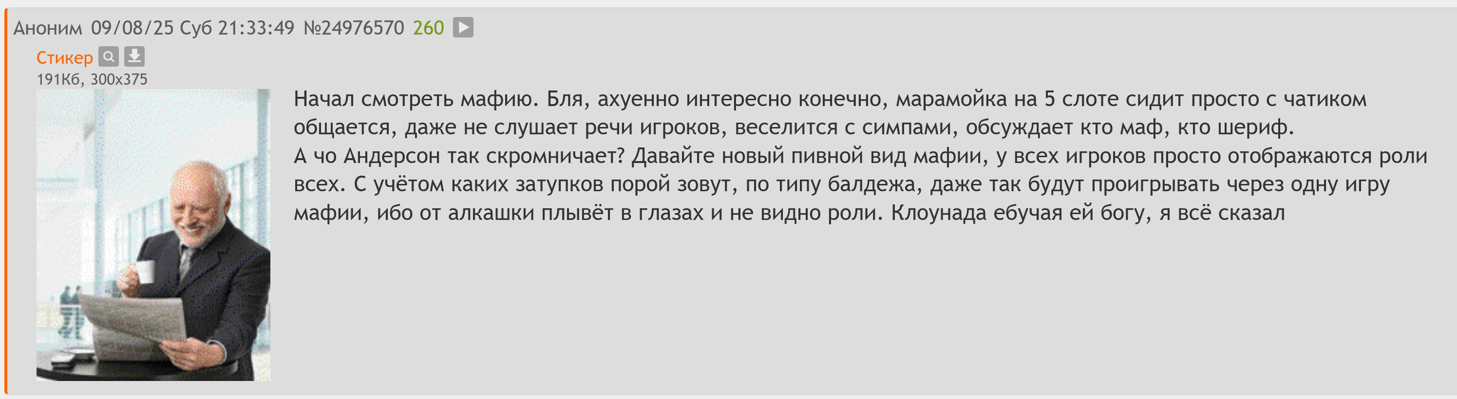 Пикрил пост я вчера написал после всего нескольких минут просмотра ПЕРВОЙ игры. И я не понимаю почему Мэддисон в итоге бомбит, ведь сразу было понятно что она палит чат. Она блядь в Мафии, где самое важное СЛУШАТЬ других игроков (в идеале записывать что они говорят) ВО ВРЕМЯ ЧУЖИХ РЕЧЕЙ ОБЩАЕТСЯ СО СТРИМОМ. Вы же понимаете что невозможно одновременно СЛУШАТЬ И ГОВОРИТЬ. А уж тем более ЧИТАТЬ ГОВОРИТЬ И СЛУШАТЬ. Вот реально никто так больше не делает в основном, все сидят молчат, слушают, кто-то записывает. А она хихи-хаха, блаблабла траляляля. А нахуя слушать других игроков, когда тебе напишут симпы чо и как? И я чатик посмотрел там всё так и было. Модеры даже таймачи за это не давали. Челы писали хуйню в духе "ОЙ ШЕСТЁРКА ТЕМНИТ, ОЙ ДВОЙКА ТЕМНИТ" и по совпадению всегда всё правильно у чатерсов, а хули ёпта, много ума не надо соседний стрим открыть. Чтоб вы понимали у неё даже саб-мода не было никакого и когда она проверила в той игре Жопича, у неё были скрыты роли и проверка не показалась. СЛАВА БОГУ В ЧАТИКЕ ЕЙ НАПИСАЛИ ПРО РОЛИ В НАСТРОЙКАХ И ОНА СО СЛОВАМИ "ОЙ Я ЖЕ РЕАЛЬНО СКРЫЛА РОЛИ" ВКЛЮЧИЛА ИХ В НАСТРОЙКАХ И УВИДЕЛА МЭДА ЧЁРНЫМ.