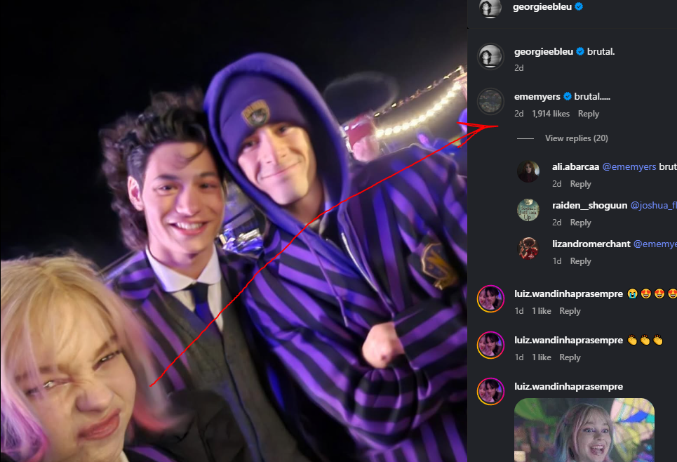 Ортега: Но мы увиделись только один раз! Так что, когда мы прибыли в Ирландию, чтобы снимать «Уэнсдэй», было приятно наконец увидеться.