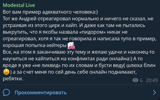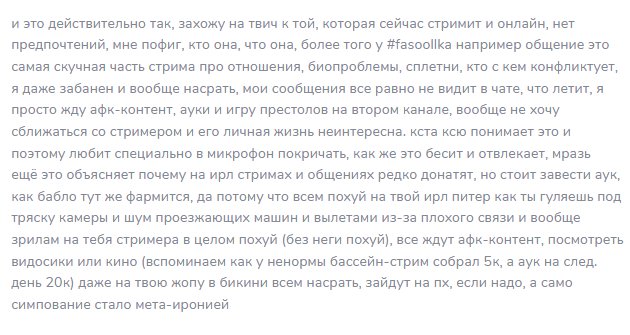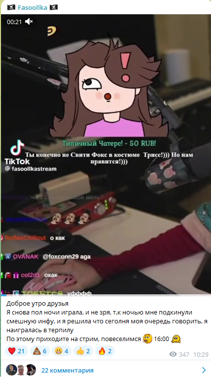 хахахаха зашел к кобыле, она там под пивом снова ноет как ее все кинули, оставили не с чем, и какие лицемеры чуханка, прыщ и остальные московские стримеры, как она повзрослела и так далее, можно прямо на цитаты разбирать
