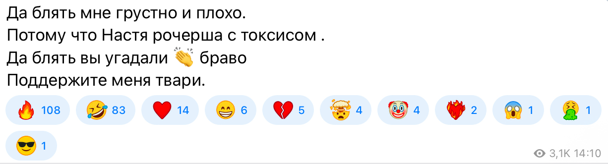 >>25013434 Бля, я как-то незадолго до того как пить бросить, тоже имел такой момент. Бокал расхуярил о стол, осколок мне руку поранил и кровь чуть шла, а еще другой отлетел в экран и мне пришлось новый монитор покупать. Вот тогда я осознал что пора бросать, ибо всегда считал что мой алкоголизм он про веселье, но понял что могу начать и вредить и разрушать, а это бяка.