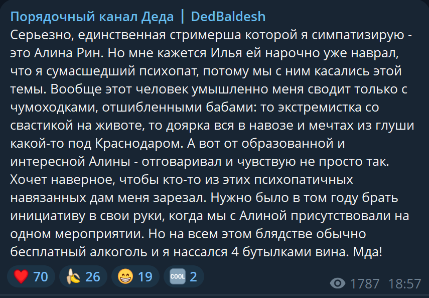 Это на каком таком мероприятии вместе были Дед и Скуфина? Я помню, что Скуфина в 2024 в конце вылезала на сходку Дианочки. Но Деда Балдежа я там не помню. Куда вообще еще Скуфина выбиралась в прошлом году?