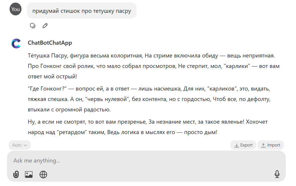 блять ору, я даже не писал ему кто такая тетушка пасра и не было никакого контекста хоть и не в рифму получилось, но доставляет, пасру действительно знают миллионы!