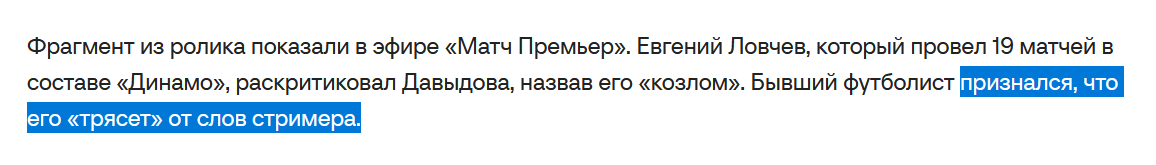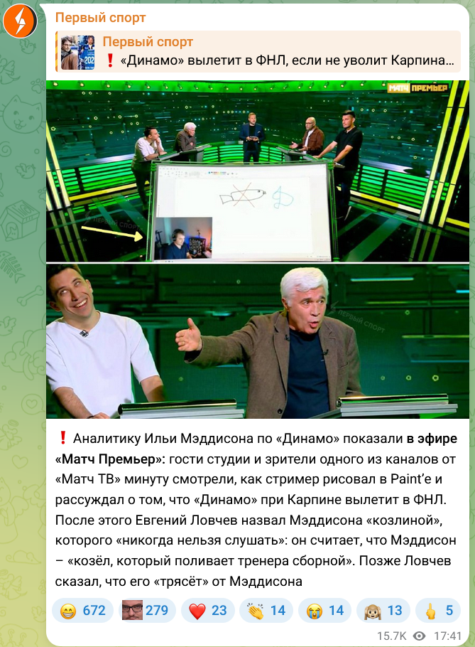 >❗️Аналитику Ильи Мэддисона по «Динамо» показали в эфире «Матч Премьер»: гости студии и зрители одного из каналов от «Матч ТВ» минуту смотрели, как стример рисовал в Paint’е и рассуждал о том, что «Динамо» при Карпине вылетит в ФНЛ. После этого Евгений Ловчев назвал Мэддисона «козлиной», которого «никогда нельзя слушать»: он считает, что Мэддисон – «козёл, который поливает тренера сборной». Позже Ловчев сказал, что его «трясёт» от Мэддисона