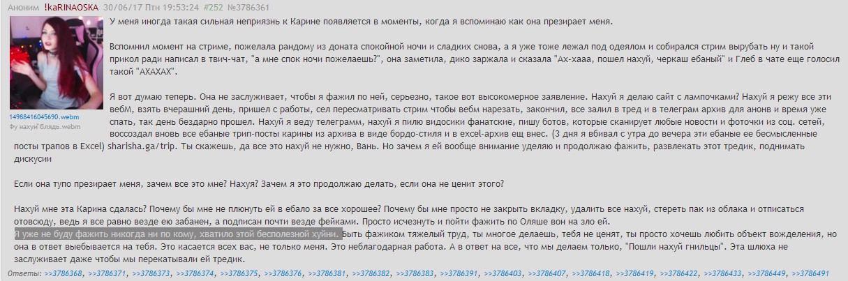Вы тут, как бабки у подъезда, АНАЛлизуете каждый пук, каждый вдох, каждый, блядь, шаг, и везде приплетаете «о-о-о, а тут она ебалась, ебется пидор, лох, пидор». Ладна бы бабы сидели в треде, но НЕТ, хуже – это шизы, которые никак не борются со своим заболеванием и срут в унтернетах.