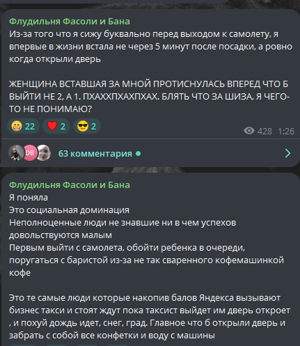 >>25030370 В том и дело, что без разницы первым ты выйдешь из самолета или вторым, вы поедете на одном автобусе. Тут очередное обсасыванием ситуации в ТГ, хотя ситуация не стоит выеденного яйца. Ещё и терпилой кого-то называет))) При том, что как обычно засунула язык в жопу, но в ТГ обязательно нужно высрать пасту как перед ней не лебезят люди, которым на неё похуй+похуй ДУМОЙТЕ