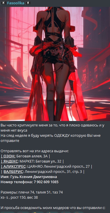 Ставлю что пост выше это сам вовощ, только он может писать с такими ошибками банальными, путать ленинский и ленинградский проспекты, ссылаться на пост с адресами и подарками зачем то, когда еще пол года, а тои больше ее адрес тупо по незанавешенному окну прочекали из тиктока.