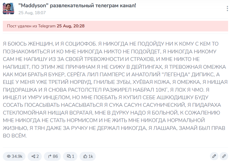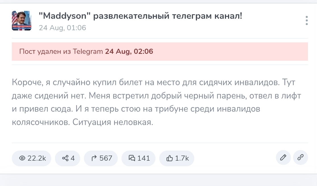 >>25078207 >>25077230 Мне кажется, это я частично виноват, что на спортс.ру (и на кибере) каждый "пук" Мэда освещают. Этим я начинал заниматься еще в начале 10-ых (например, его тег именно я создал), а в 15-м году, когда он уже активно стримил, стал у него модератором. Вот уже более 10 лет "модерирую". Ну а хоть к спортсу уже давно не имею отношения, там Мэд лишь всё популярнее становится с каждым годом - и обсуждают его больше даже не в новостях с его участием (потому что там редирект на кибер идет), а в новостях про Джеймса Мэддисона.