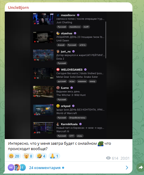 А вообще на самом деле картина ясна. Это очередной договорнячок твича и ркн, как было ранее с х-стримерами. На публике они типа угрожают друг другу и все дела, а на деле там просто договорённость выдворение всего ру сегмента для того, чтобы эти дармоедв перекочевали на вк плей и тому подобное. Твичу абсолютно похуй на ру сегмент, он ничего не потеряет, решительно ничего. На публику насрать, на скот в лице стримеров насрать, на всех поебать. Но вот ругаться с целым правительством им не в жилу, вот и разыграли этот спектакль со штрафом, санкциями и так далее. А ркн это прежде всего выгодно потому что наконец будет приток в их обосранные площадки, так как в нормальную конкуренцию никто не умеет. То, что сервера и сам сервис в целом не выдержат наплыва им похуй, главное количественный результат для отчётов, мол, деньги отсвоены, вон народу сколько, девать некуда. Так вижу.