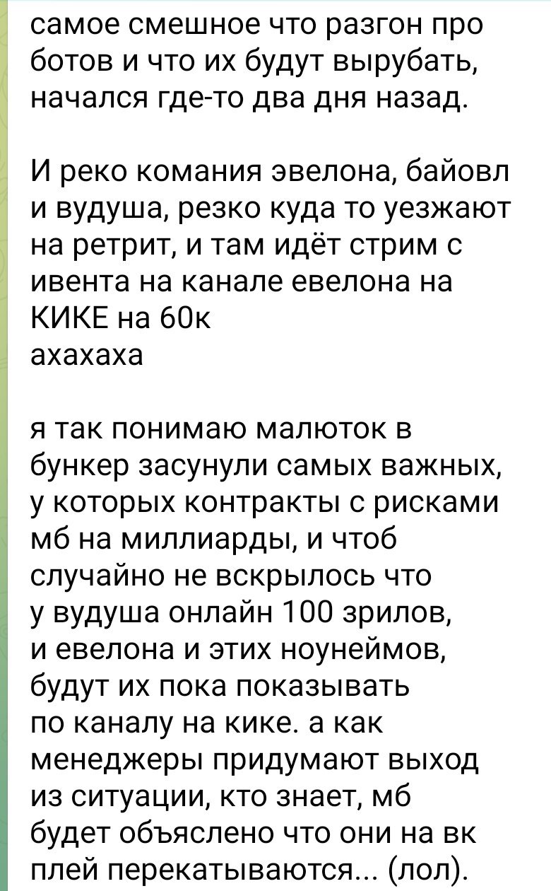 Ребят, вы не понимаете, это баг, багулина смекаете. Вы что, не верите, что вротхауса, гитмана, сыкала, калмика и прочих не смотрят более 1к зрилов. У них не мертвый чат, гайс, просто все спят и оставляют вкладки, дабы поддержать любимого стримера. Всего лишь баг, бааааг это.
