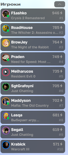 >>25089932 А ты сам думаешь для чего челу с 10 онлайна крутить себе? Чтобы хоть немного быть выше в общем списке русскоязычных стримеров. Чем больше цифра - тем больше шанс что к тебе зайдет случайный живой человек