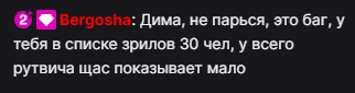 >>25085718 Что Гилти крутит давно выяснили, когда на протяжении нескольких недель ровные 1300 держались с чатом из одних виперов. Потом приспустила цифры когда начала нагонять новых лохов через инску->тг->твич. Но всё равно в активе по больше части пишут одни и те же ники.