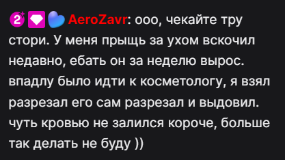 >>25083847 >>25084353 >>25084205 На вчерашнем стриме Женечка рассказывала как тянки любят давить прыщи своим парням, лохозаврик там что то стал намекать в чате и Женечка сказала чтобы он себе искал другую бабу для этого (: