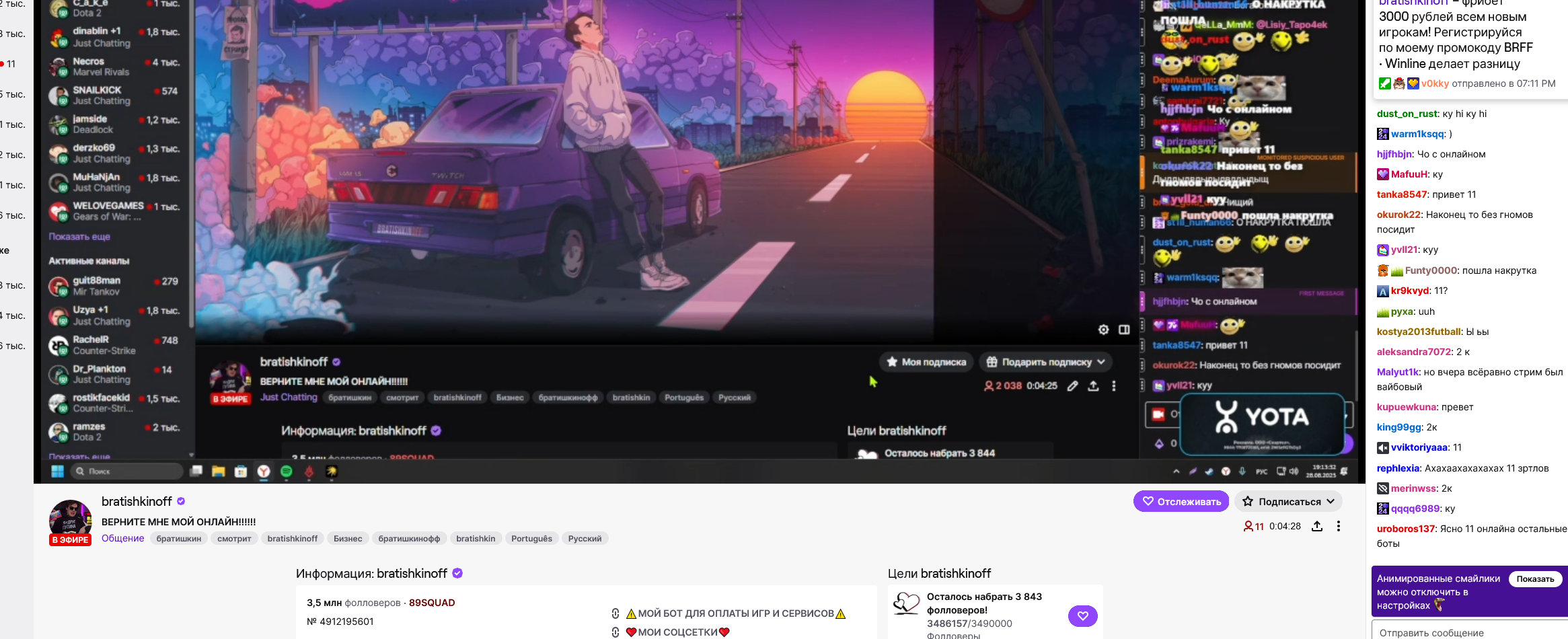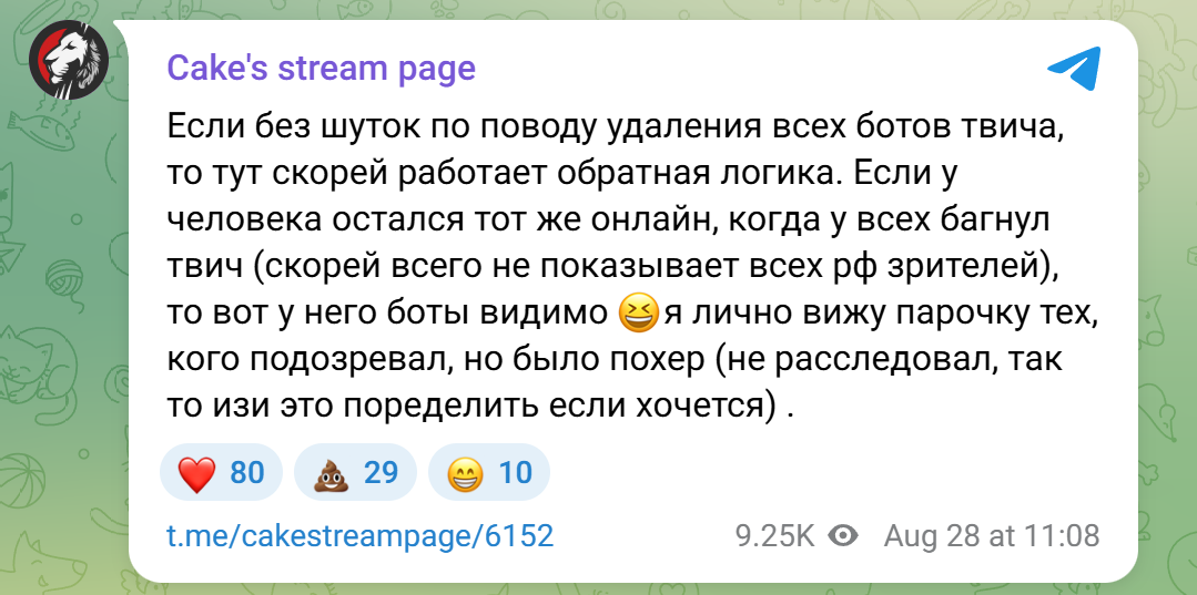 Забавно, что когда неделю назад ботов на англоговорящем твиче резали, то у большинства где-то на треть сократилось, а у нашего твича минимум на половину, как у Гилти, у ВЛГ и Кейка вообще в несколько раз, в пабликах постоянно читаю, что какой-нибудь очередной дебс влетает в мировой топ, неудивительно, крутят как не в себя