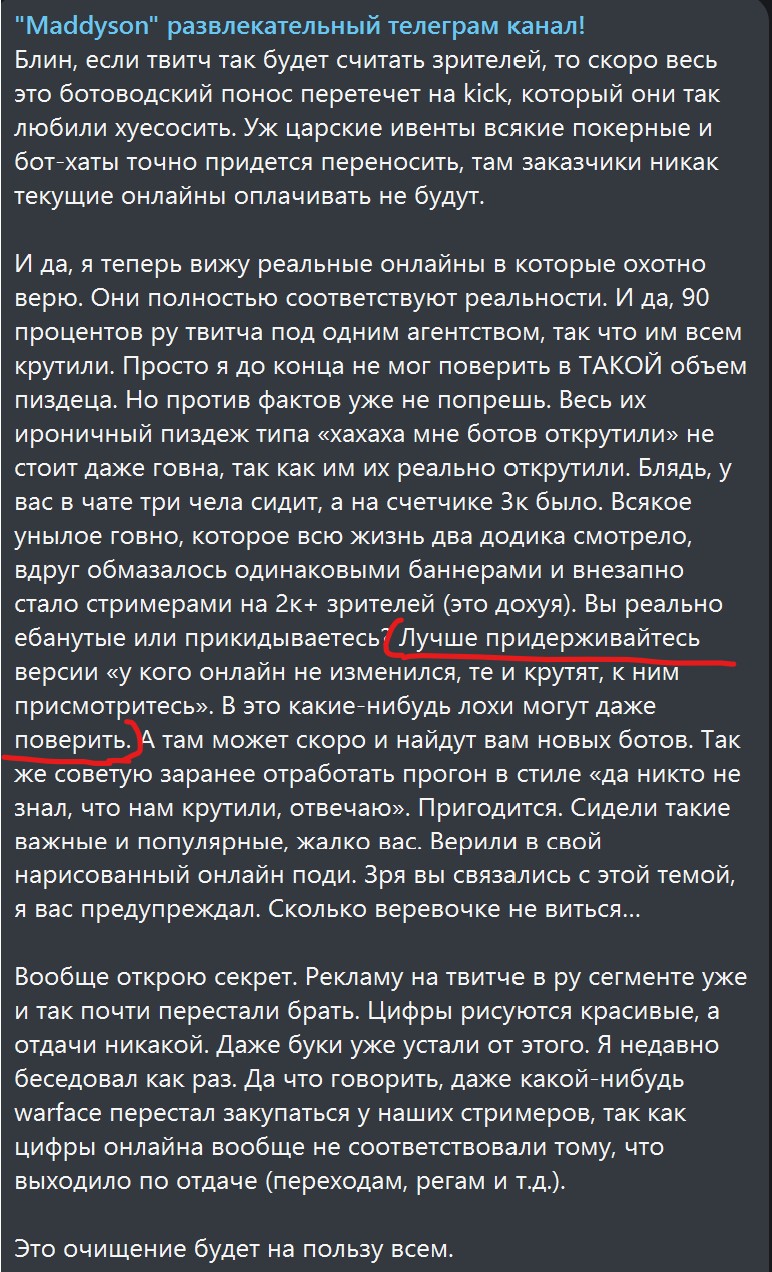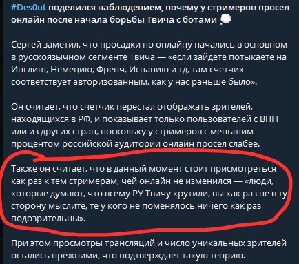 Жопич признается, что почти весь онлайн твича это боты, стример Ссяки утверждает, что российских зрилов притесняют, а показанный онлайн это типа иностранцы. Перекрытие от Женечки в приватке было какие-нибудь?