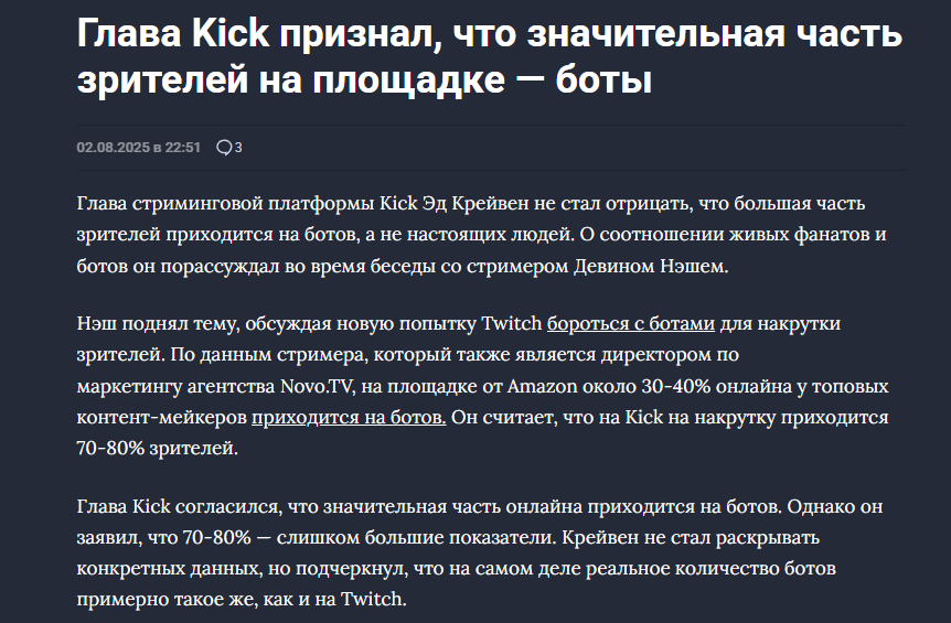Забавно что как пруф ботоводства кидают высер ресентиментного ДТФера. Понять можно, в бородатых годах стримил на сотку, в подписчиках Юзя, Джус, ОляВуду, а сейчас восемь калек смотрят. Еще почему-то все связывают с твитом твич сапорта месячной давности, а не к штрафу РКН в 60 лямов, который был за день до, закону о приземлении, где надо иметь офис в РФ если 500к активных юзер, теневого бана 1080p качества и т.д https://dtf.ru/life/3993880-russkij-segment-twitch-nakrutka