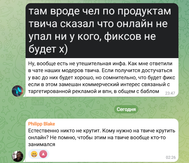 согласен дурацкий баг от твича надеюсь пофиксят и наши любимые стримеры вернутся на прежний онлайн и будут радовать вкусными баннерами от додо пиццы, веселыми ивентами от винлайна и задроными рейдами на сирусе!