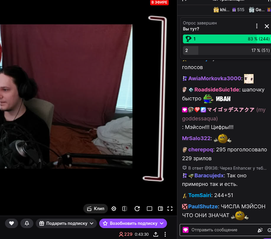 >>25100808 Сколько длилось голосование? Если 30 секунд, то странная хрень Если 5 минут, за это время могли заходить новые люди, голосовать и ливать (либо их даже попросили зайти в конфах каких-нибудь) Куда палевнее, что столько голосующих нашлось. Когда у стримеров рандомный вопрос о планах, типа игра или кино, обычно голосует меньше половины присутствующих