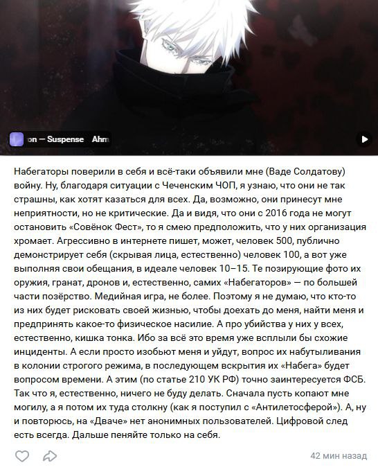 После блокировки его группы он вообще молчал месяц, и потом изошелся на лютое говно и зашизил ещё больше. Видимо сейчас тоже ульту копит, хочет выкатить пост как он нанес кому то реальный вред. Вообщем пидор