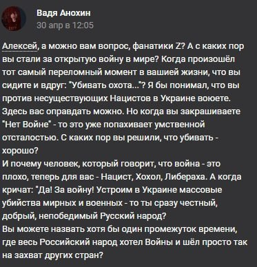 >>25003295 (OP) О, так Вадя плачется, что нас на него натравили. Так то оно может и так, но вот только он сам сразу зашёл с угроз треду, как привык с вкашными хомячками делать, чем сам настроил набегаторов против себя. Ну пускай разгребает теперь, лол, а мог всё решить за пару постов в этом итт треде и у себя в группе.