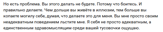 Андрей (Биба) показал свое бесстрашие, а таких людей я искренне уважаю. И мне не важно кто на чьей стороне, я изначально и не ставил целью примкнуть к какой-либо стороне.