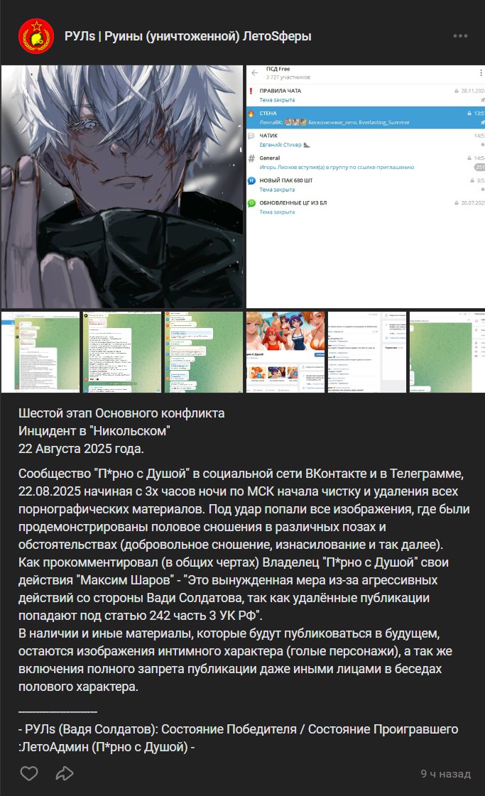 - "Soviet Games" - Удивлённый и растерянный ( 25 Января 2022 - 20 Мая 2025 - настоящее время ) - ... - - - - "Храм Богини Алисы" - Смертельно ранен ( 3 Декабря 2021 - 20 Мая 2025 - настоящее время ) - ... - "Храм Богини Слави" - Раненный ( 8 Марта 2022 - 19 Марта 2024 - Настоящее время ) - ... - "Храм Богини Ульяны Лениной" - Смертельно ранен ( 3 Декабря 2021 - 5 Января 2024(!) - 21 Марта 2025 - Настоящее время ) - ... - "Храм богини Юли-тян" - ??? ( 3 Декабря 2021 - 10 Января 2024(!) - Настоящее время ) - ... - "Храм Богини Жени" - Впал в бегство ( 24 Марта 2022 - 1 Февраля 2023 ) - ... - "Храм Богини Икаруса 410" - Напуганный ( 26 Февраля 2023 - 7 Ноября 2024 - Настоящее время ) - ... - - - - "ПАЗ-410" - Смертельно ранен / Напуганный ( 18 Декабря 2021 - 13 Апреля 2022(!) - 9 Января 2023(!) - 2 Июня 2023(!) - 4 Июля 2023(х3) - 23 Ноября 2024(!) - 20 Мая 2025 - Настоящее время ) - ... - "Зашквары ЛетоСферы" - Серьёзно ранен / Напуган ( 27 Ноября 2021 - 21 Февраля 2025 - Настоящее время ) - ... - "Бесконечный Совёнок" - Без сознания ( 2 Декабря 2021 - 16 Июля 2023 ) - ... - "Партия Достойных Совят Четвёртого Рейха" - Без сознания ( 13 Декабря 2021 - 21 Февраля 2025 - Настоящее время ) - ... - - - - "Порно с Душой" - Раненный / Метка смерти ( 5 Июля 2024 - 15 Мая 2025 - Настоящее время ) - - "Samantha: In&Fun" - Под влиянием страха... ( 23 Декабря 2021 - 30 Июня 2024 - Настоящее время ) - ... - - - - "Хижина Дедушки Домарощинера" - ??? ( 21 Апреля 2022 - 4 Октября 2024 ) - ... - "Третий Храм Святой Елены" - Напуган / Без сознания ( 29 Декабря 2021 - 21 Ноября 2023 - Настоящее время ) - ... - "Летач" - Мертв ( 4 Февраля 2022 - 25 Марта 2024 ) - ... - "Dolboeb Studio" - Ложное чувство победы ( 27 Ноября 2021 - 25 Февраля 2023 - Настоящее время ) - ... - "Пионерская Стройка" - Без сознания ( 25 Августа 2022 - 4 Февраля 2025 - Настоящее время ) - ... - "Бесконечная Серость" - Без сознания ( 10 Января 2023 - 8 Июня 2023 ) - ... - - - - "Smolev" - На поле битвы ( 29 Мая 2024 - Настоящее время ) - ... - "LEONZO" - В бою ( 20 Мая 2025 - Настоящее время ) - ... - "Liz Joestar`s" - Раненная ( 31 Мая 2024 - 6 Июля 2024 - Настоящее время ) - ... - "Креветка тян" - Серьёзно раненная ( 3 Сентября 2023 - 9 Сентября 2023 - Настоящее время ) - ... - "Kurisu" - Без сознания ( 1 Ноября 2022 - 11 Марта 2023 - Настоящее время ) - ... - "Нейросетевое лето" - Серьёзно ранен ( 9 Июня 2023 - 17 Июня 2023 - Настоящее время ) - ... - "Нейросфера" - На поле битвы ( 17 Февраля 2025 - Настоящее время ) - ... - "Нейроме" - Напуган / Без сознания ( 23 Августа 2023 - 31 Декабря 2024 - Настоящее время ) - ... - - - - "Poslesvet Studio" - Напуганный / Уставший ( 14 Июня 2023 - 27 Июня 2023 - Настоящее время ) - ... - "Первый Лист Осени" - Серьёзно ранен / Напуганный ( 13 Ноября 2023 - 10 Сентября 2024 - Настоящее время ) - ... - "Morylok Studio" - Мёртв ( 21 Июня 2023 - 23 Июня 2023 ) - ... - "ПИОНЕРКА" - Без сознания ( 21 Июня 2023 - 9 Июня 2024 - Настоящее время ) - ... - "Landa |PS|" - Без сознания ( 17 Февраля 2024 - 28 Января 2025 ) - ... - "Музыкальный кружок Мику" - На поле битвы ( 19 Августа 2024 - 22 Ноября 2024 - Настоящее время ) - ... - - - - "Рейхстаг: Совёнка" - Без сознания / Хотел впасть в бегство ( 15 Мая 2023 - 14 Ноября 2023 - Настоящее время ) - ... - "Пацаны и 2 Рота" - Смертельно ранен / Напуганный ( 20 Апреля 2024 - 4 Апреля 2025 - Настоящее время ) - ... ................ - "Shiza Letofaga" - Самоубийство перед страхом ( 4 Декабря 2021 - 12 Декабря 2023 ) - ... - "КофеЧайное лето" - Самоубийство перед страхом ( 4 Декабря 2021 - 6 Ноября 2022 ) - ...