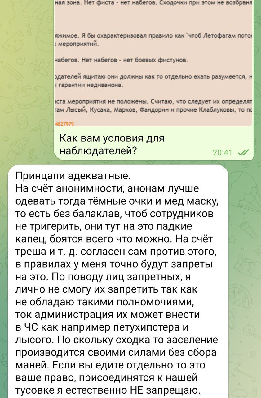 · НАБЕГ НУЖЕН НЕ ДЛЯ ТОГО, ЧТОБЫ УСТРАИВАТЬ УЛЬТРАНАСИЛИЕ ПРОТИВ ФИСТУНОВ, ОРГОВ И КОСПЛЕЕРШ. ПРИЗЫВАЕМ ГНАТЬ ССАНЫМИ ТРЯПКАМИ ЛЮБОГО, КТО ПРИЗЫВАЕТ К НАСИЛИЮ ПРОТИВ УЧАСТНИКОВ ФИСТА, СОТРУДНИКОВ ЛАГЕРЯ, МИМОКРОКОВ И Т.Д.