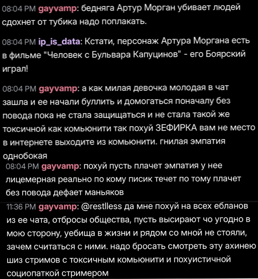 итак, 8 месяцев под чмодьем: фул релейт в калсосе, десятки рейдов от копроля, присутствие в дисах и мафиях и нулевой буст по зрилам блять, хаха может он заработал больше, чем если бы дальше тошнил в соло но что он точно проебал, это уважение зрителей, впитывая харчки чмодья, а уважение купить за деньги практически нереально