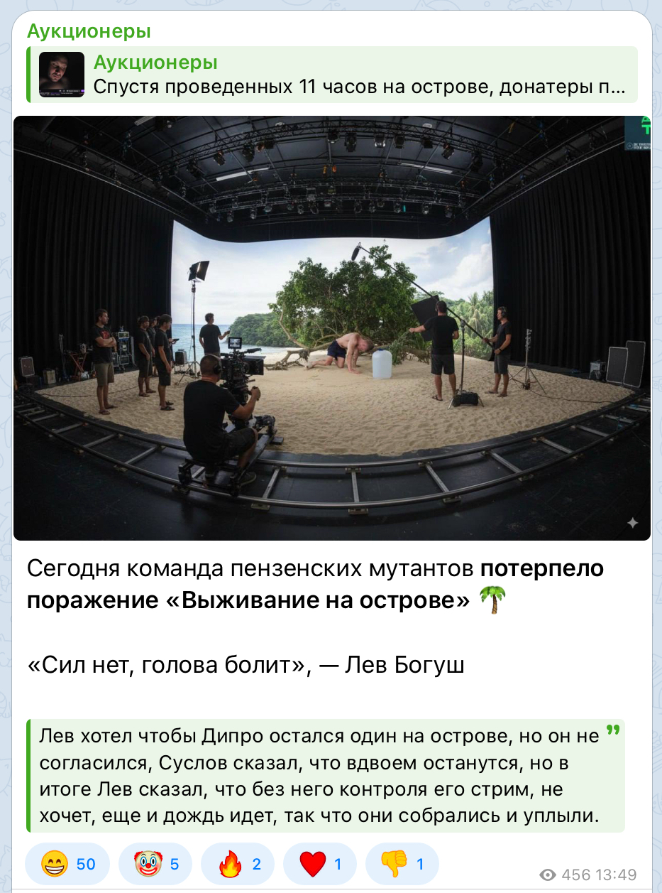 Если бан на твиче, то заканчиваем и это не поражение. Если кого-то придется госпитализировать то остальные достримят(главное чтобы один из нас оставался на острове). Сумма минуты будет меняться раз в сутки. Аукцион на еду 1 раз в сутки Аукцион на предмет 1 раз в сутки