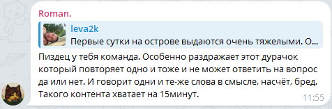 касаемо организации быта, ну такое. в целом, и так вопросики что это за "выживание" с палатками и прочей снарягой на 300-400к, или сколько он там потратил. "необитаемый" с кошкой и каким-то челом через 200 метров. я лично ожидал увидеть что-то типа Остаться в живых с Бодровым или по типу укроблогера Панасюка (лучше бы под его менторством коллабу замутили).