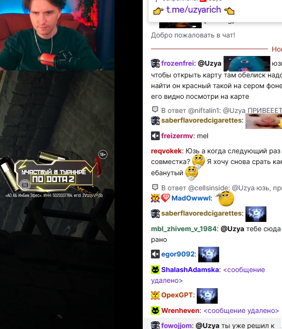 у шизи короче новая политика и разнарядка, за спам банить теперь в чате вселенское очищение так сказать из-за того что его чата коллаберы боятся, а он ведь подписался под рекламное агентство и надо коллабиться - с ним не хотят вместе стримить из-за чата и теперь вплоть до спермача за спам решил нормисом заделаться, еще стримит "без мата" бабки рубит