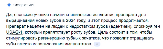 Японские ученые начали испытание на людях препарата для выращивания новых зубов. Он уже показал свою эффективность на мышах и хорьках. Такая технология поможет не только людям с врожденным отсутствием зубов, но и тем, кто лишился их из-за травм или кариеса и не может поставить протез из-за медицинских показаний.