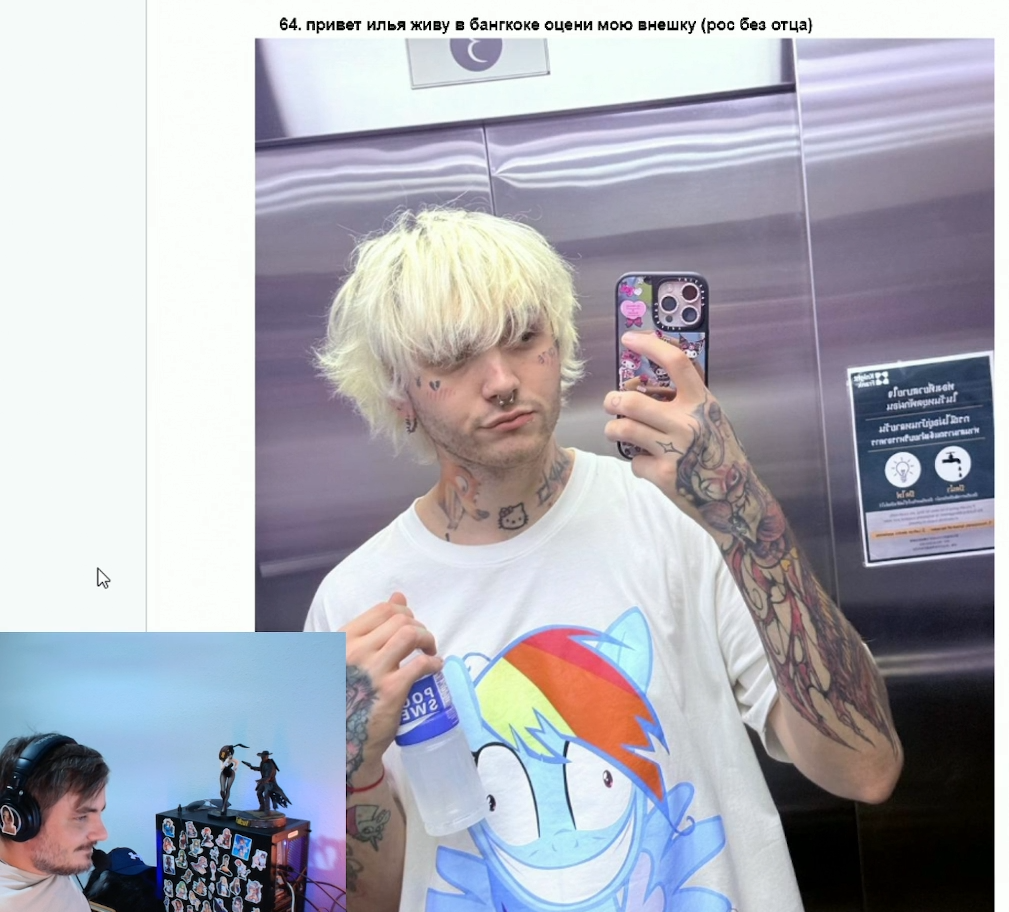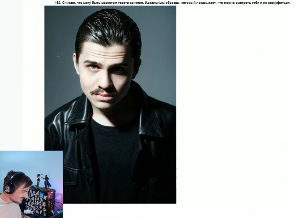 >>25134450 Пересобрал значит скорректировал свой образ. От пародии на Джастина бибера к пост ироничному пидарку. Я не взаимодействовал с ним, но на стримы бы зашел. То есть он понимает кто он, что это образ. Если бы Илья звал его вместо пьяного Хована было б идеально