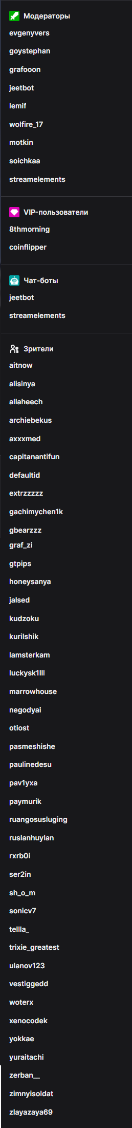второй кидает список чата аролфиша, всех пизданутых долбоебов которые смотрят вообще все стримы. а сам аролфиш просто очередная копия копий, вообще нулевой по всем параметрам, нахуя вам второй кабыч