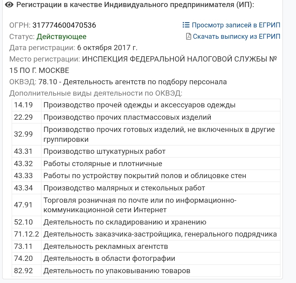 Вся суть поисков в том что мы подтвердили что все эти сотни миллионов крутятся через обычное ИП. Второе ООО которое зарегано эти летом - чисто для мерча и одежды. Оно еще не функционирует, арендовано помещение.